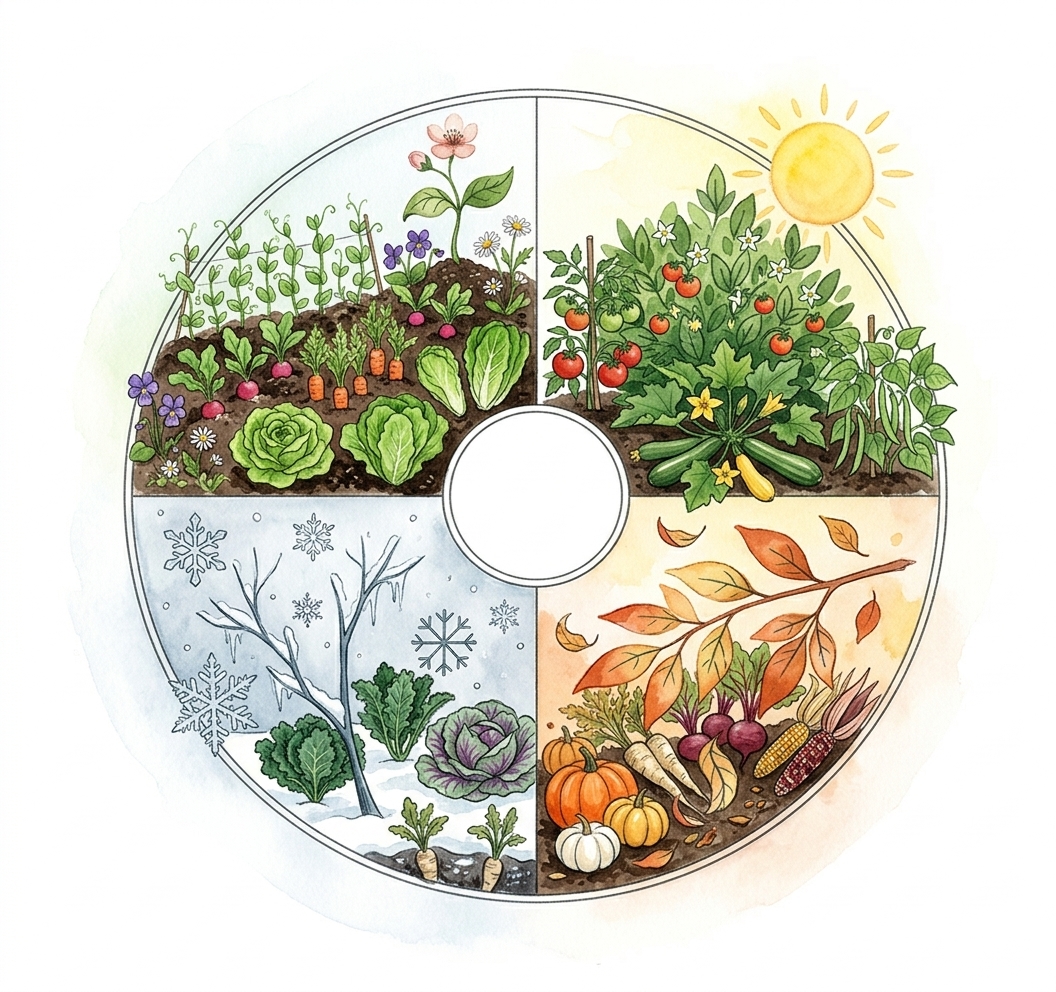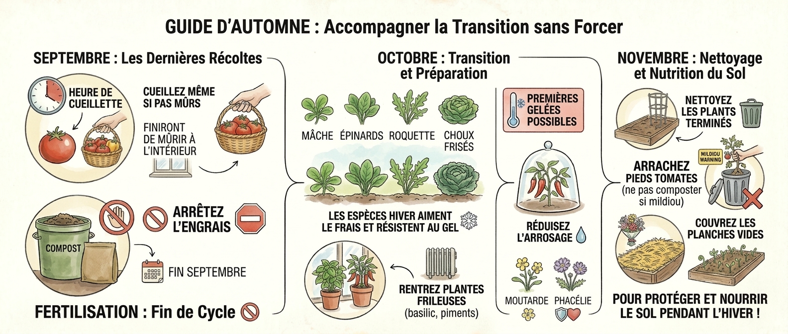 Octobre : réduisez l'arrosage progressivement. Rentrez les plantes frileuses (basilic, piments) avant les premières gelées. C'est aussi la période idéale pour les semis et plantations d'hiver : mâche, épinards, roquette, choux frisés — ces espèces aiment le frais et résistent au gel.