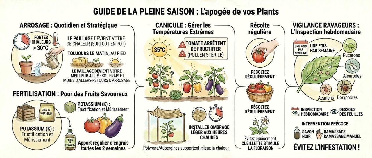 Vigilance ravageurs : c'est la haute saison pour les pucerons, aleurodes, acariens et doryphores. Inspectez le dessous des feuilles une fois par semaine. Une intervention précoce (savon noir, ramassage manuel) évite l'infestation.