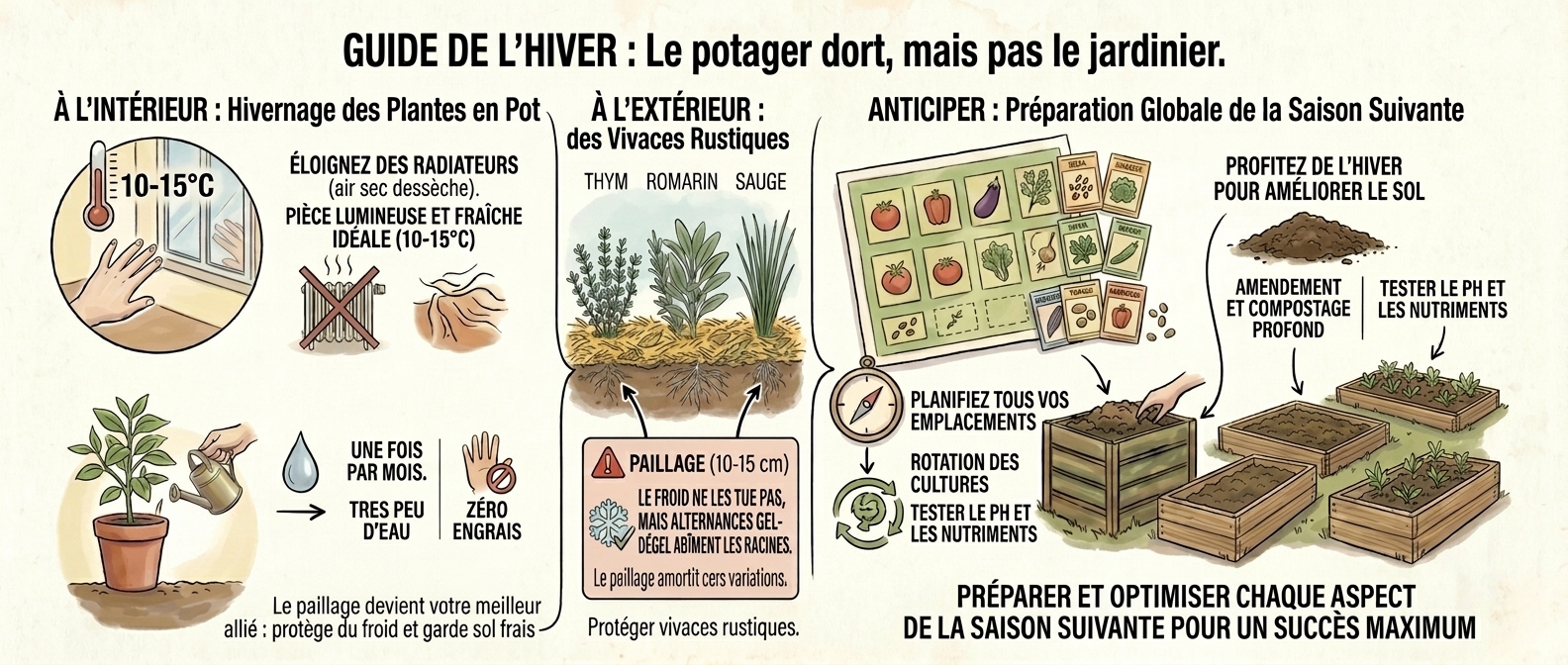 À l'extérieur : protégez les vivaces rustiques (thym, romarin, sauge, ciboulette) avec 10-15 cm de paillage au pied. Le froid ne les tue pas, mais les alternances gel-dégel abîment les racines superficielles. Le paillage amortit ces variations.